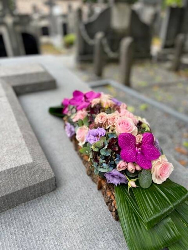 vast gestoken lang bloemstuk,met vanda orchideeën in verwerkt.