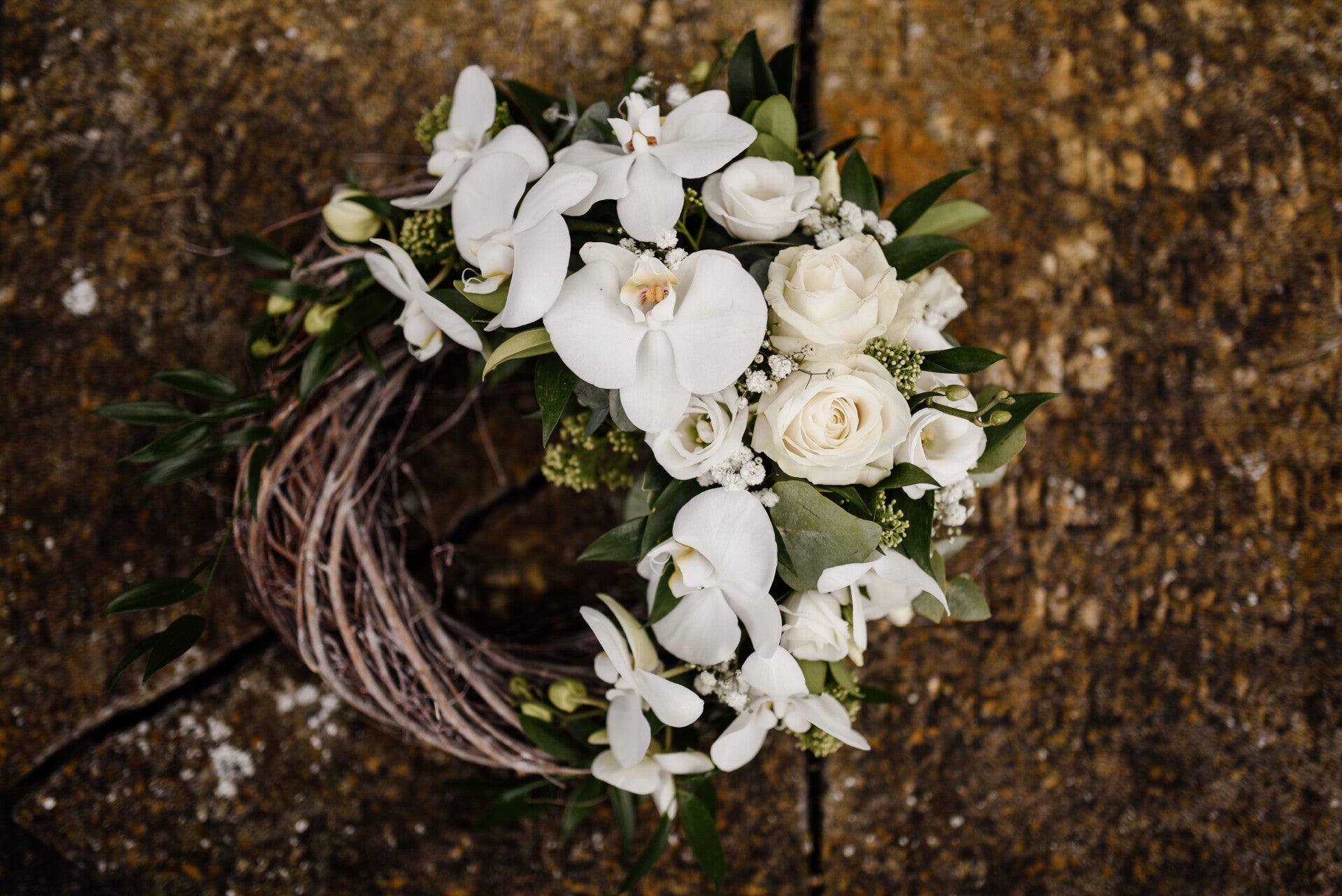 houten krans met bloemwerk op